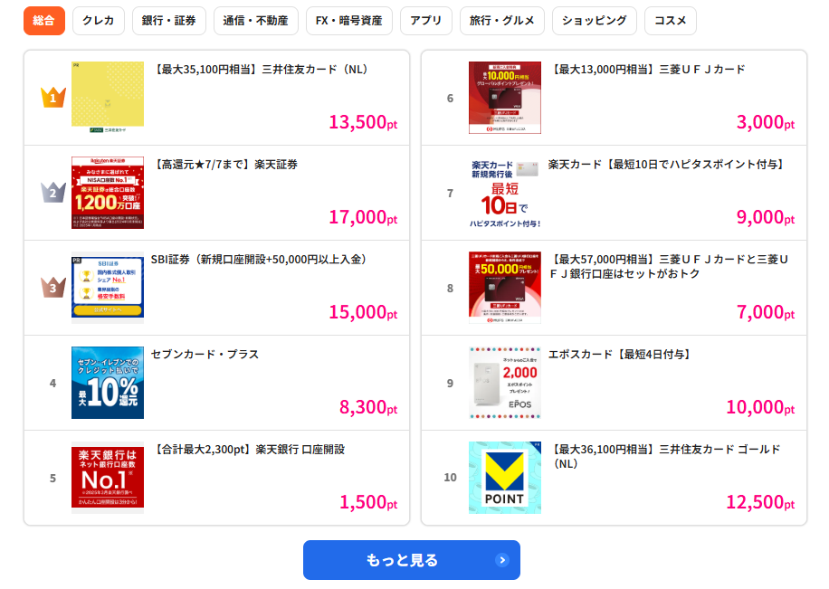 ハピタスでは、クレジットカードや銀行口座、証券口座の案件で1万ポイント以上付与されることもある。